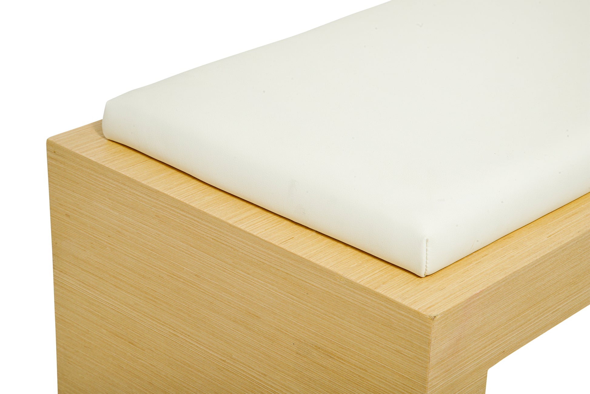 Shown in a 55" width with a custom metal finish and ivory performance mohair combination and a 63" width with a pine wood finish and white genuine leather combination.