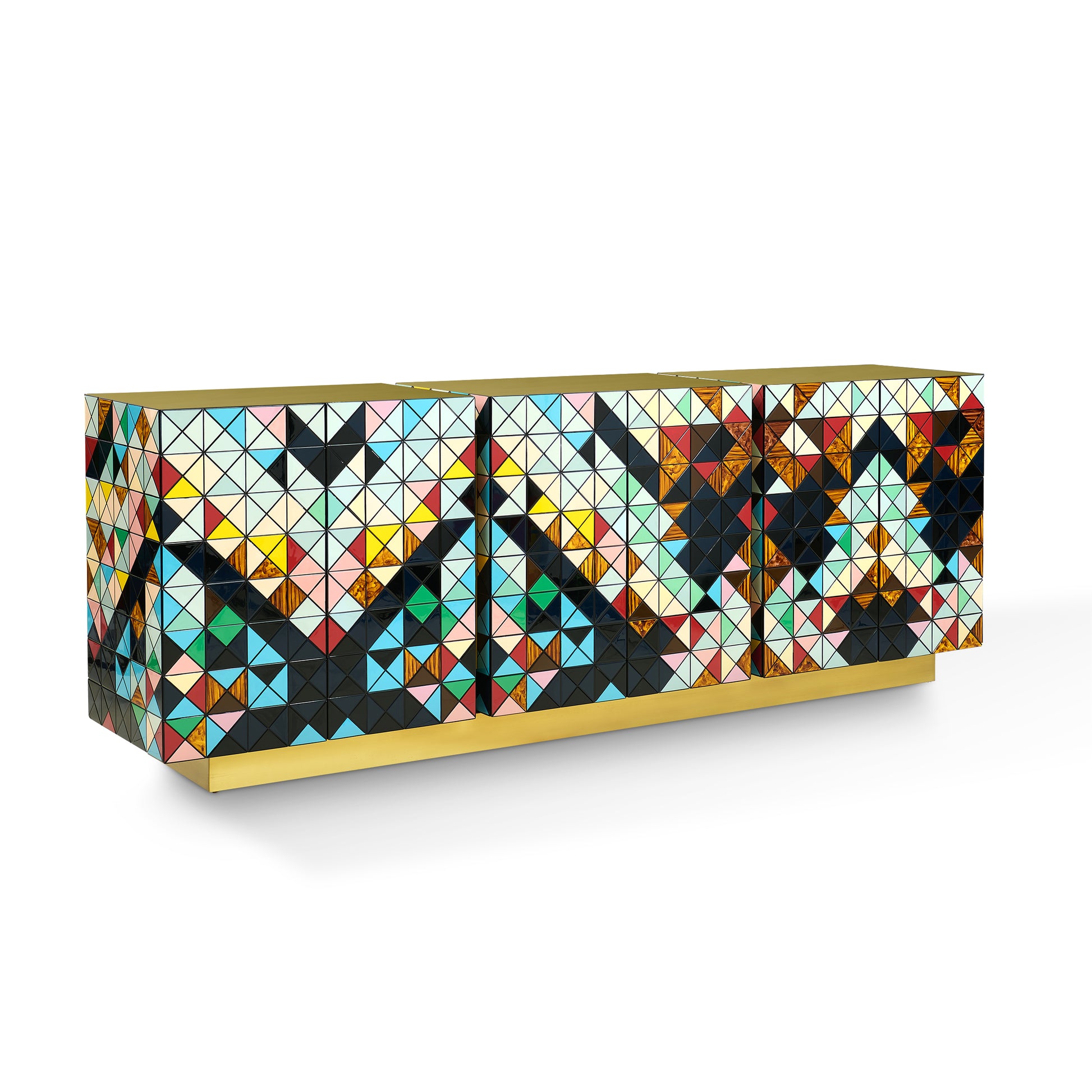 This cabinet features a multi-colored exterior and glass interior shelving.
