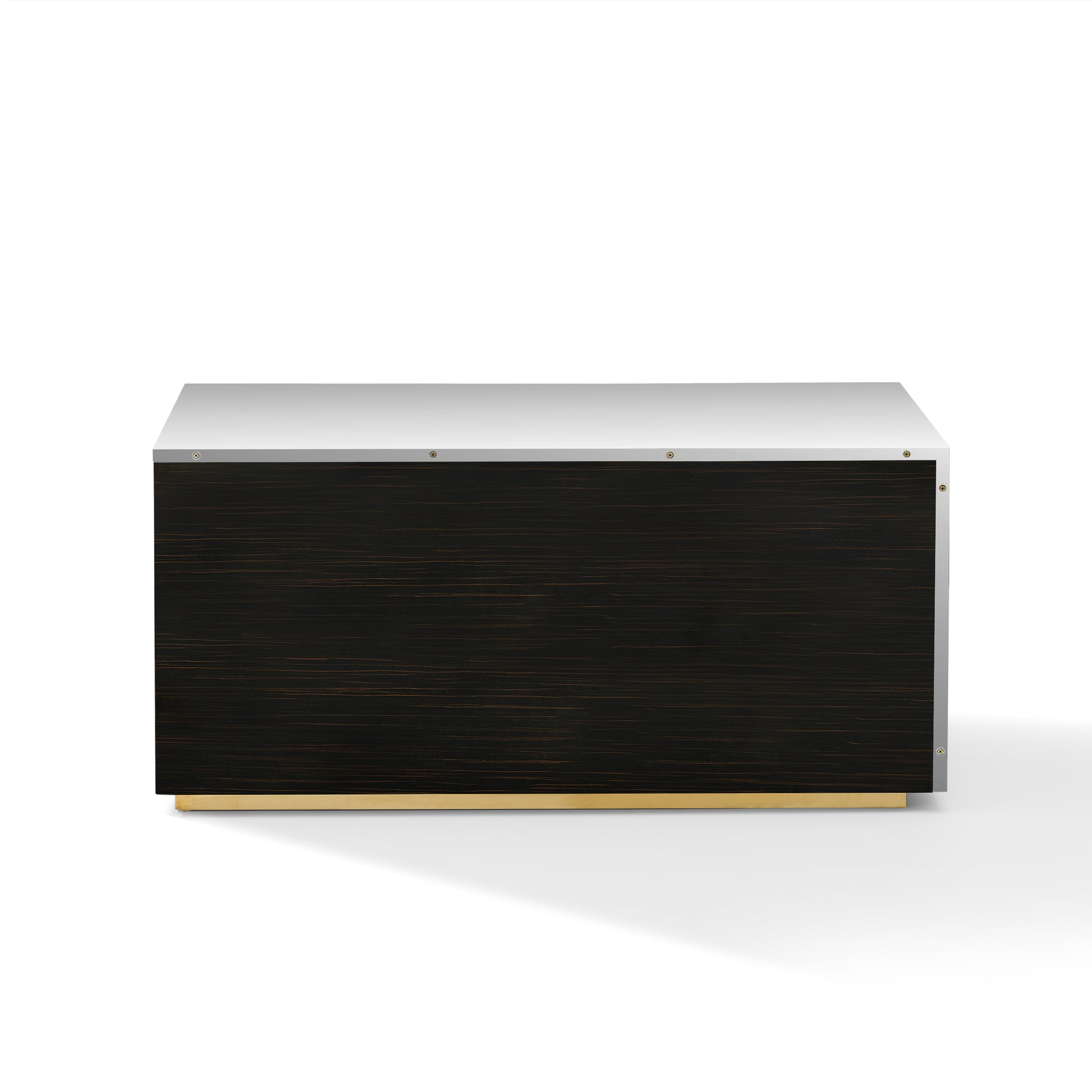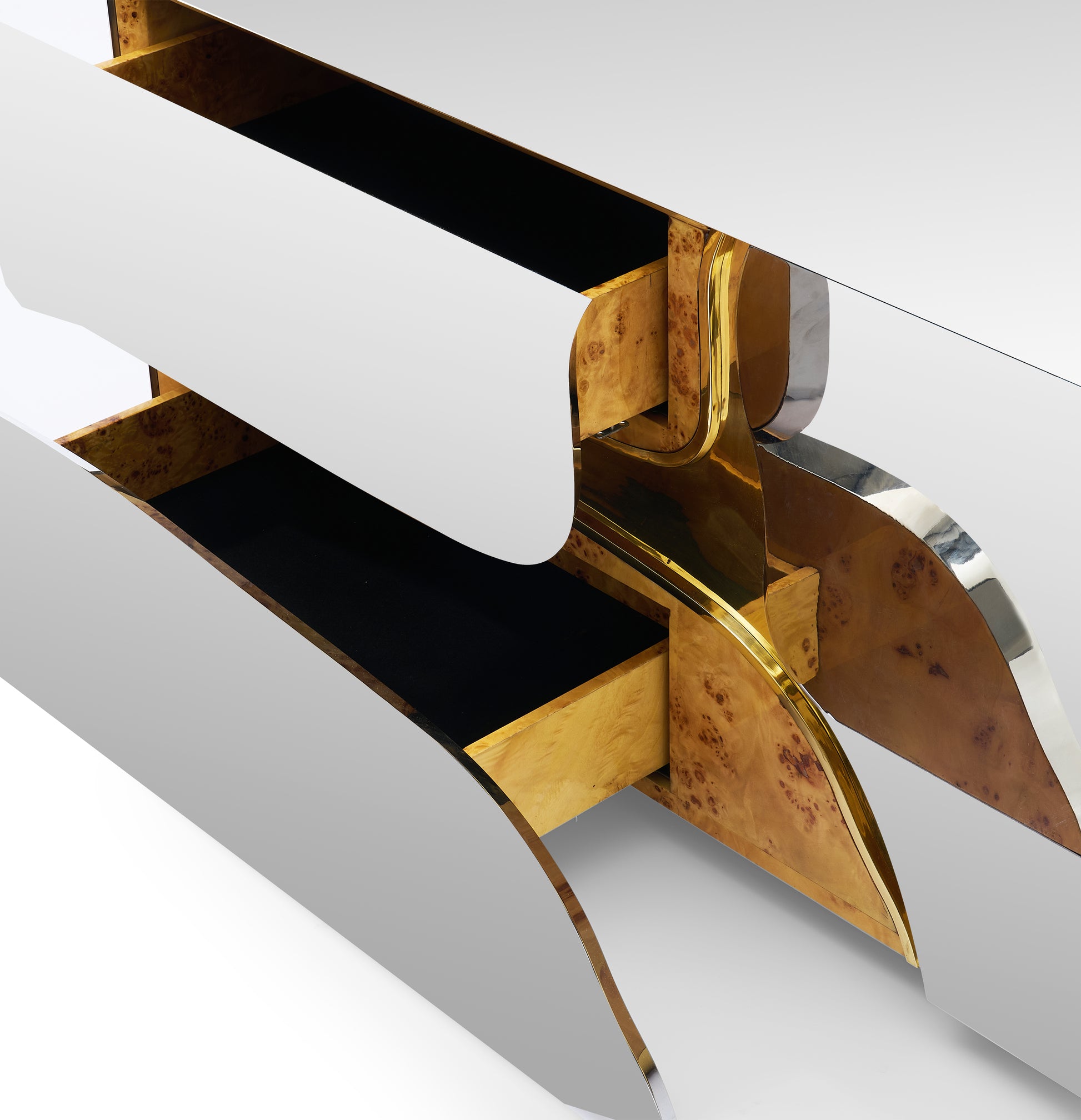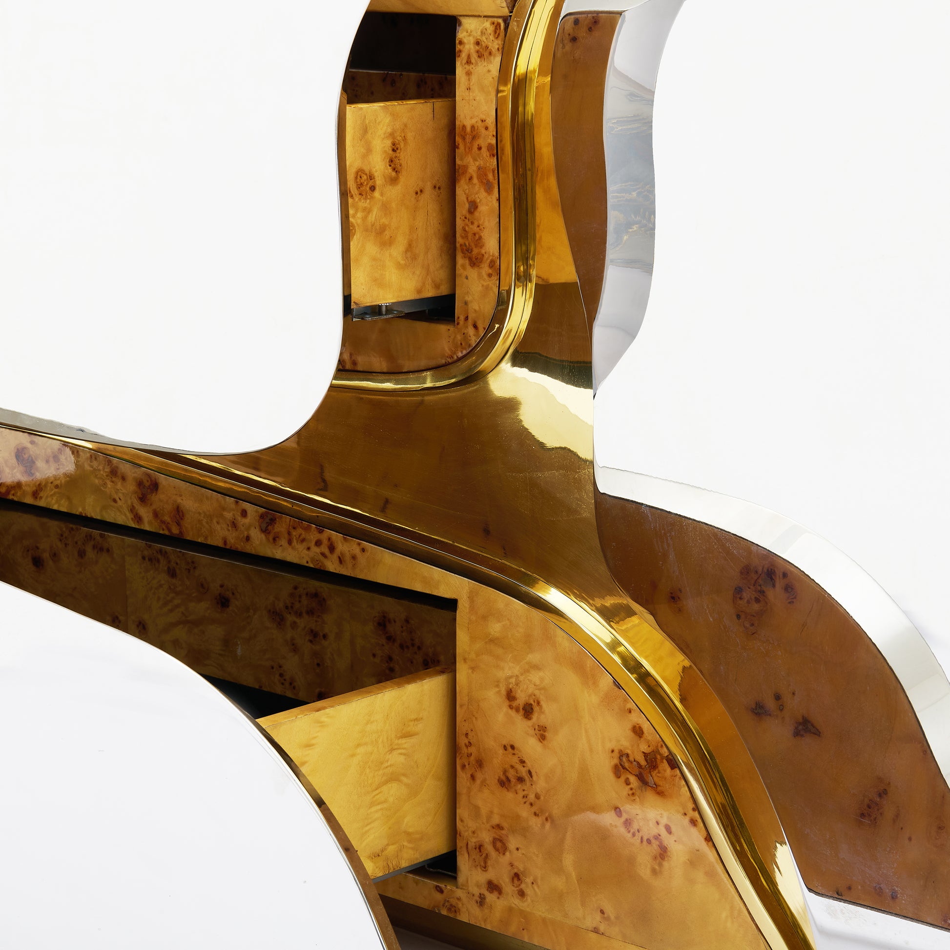 Shown in a polished gold metal finish with mirrored exterior and burlwood accent.
