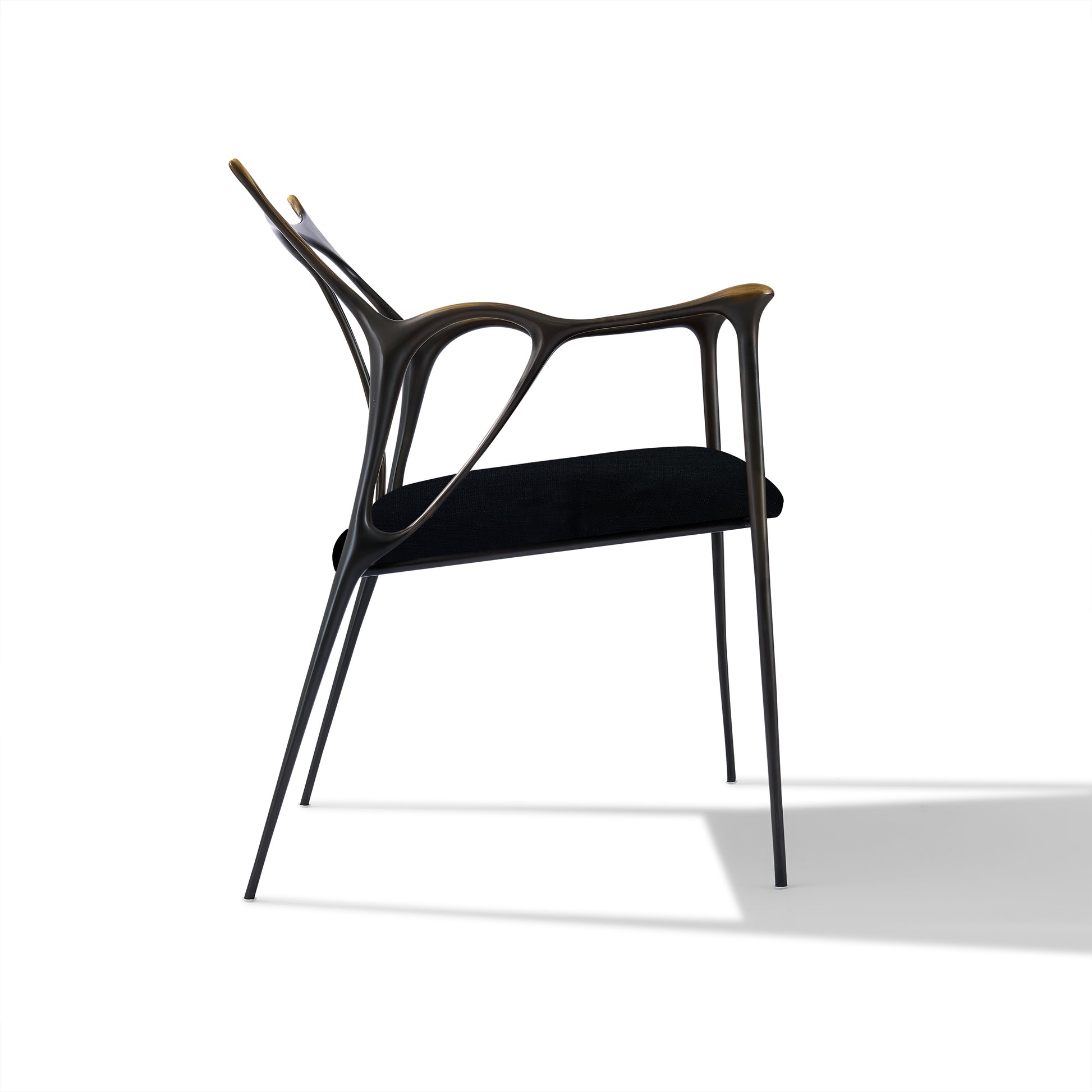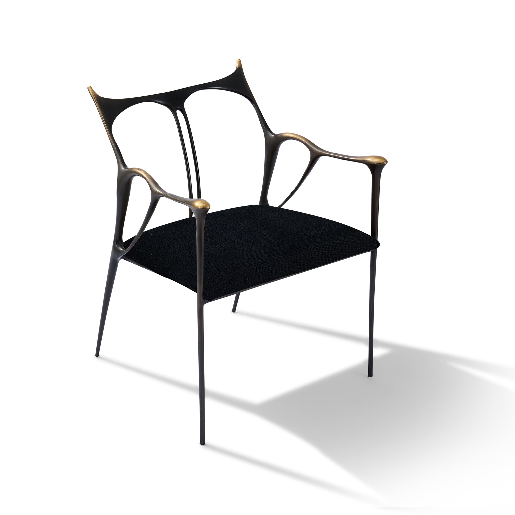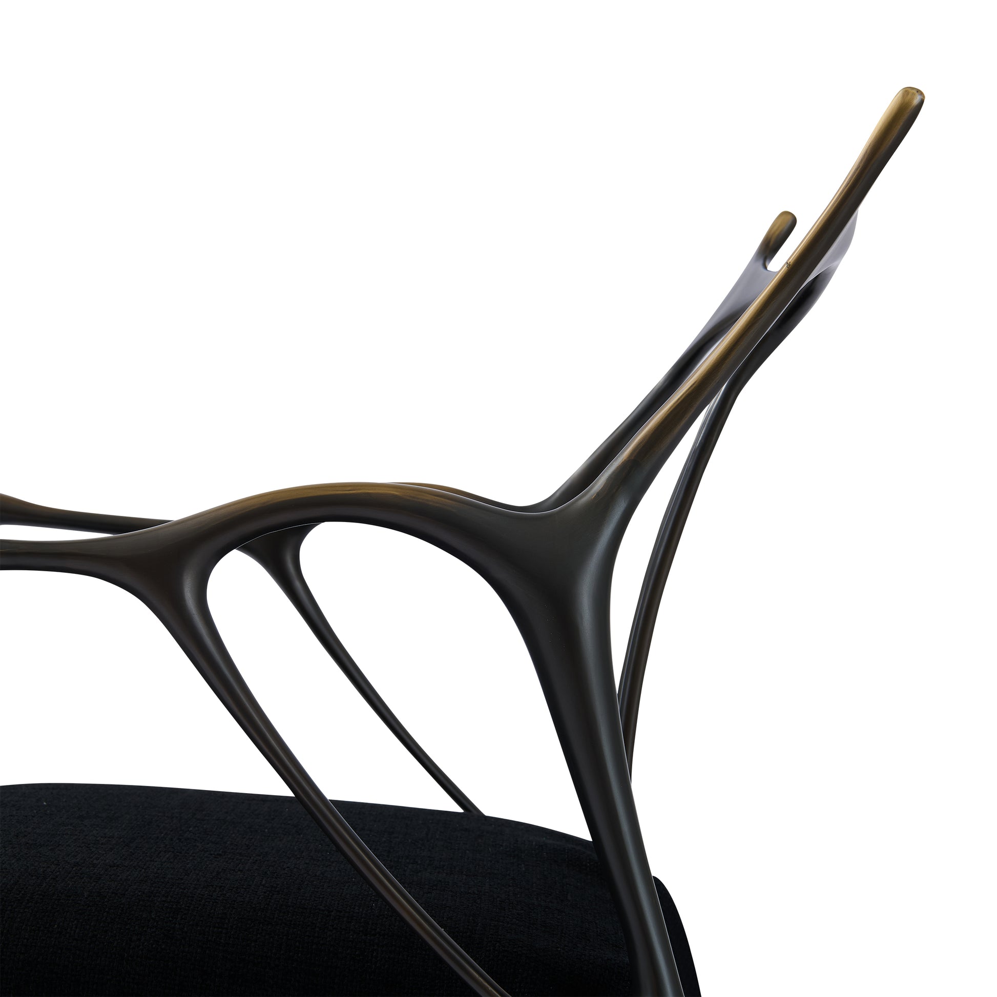 Shown in custom dark bronze metal with brushed gold accents and black fabric.