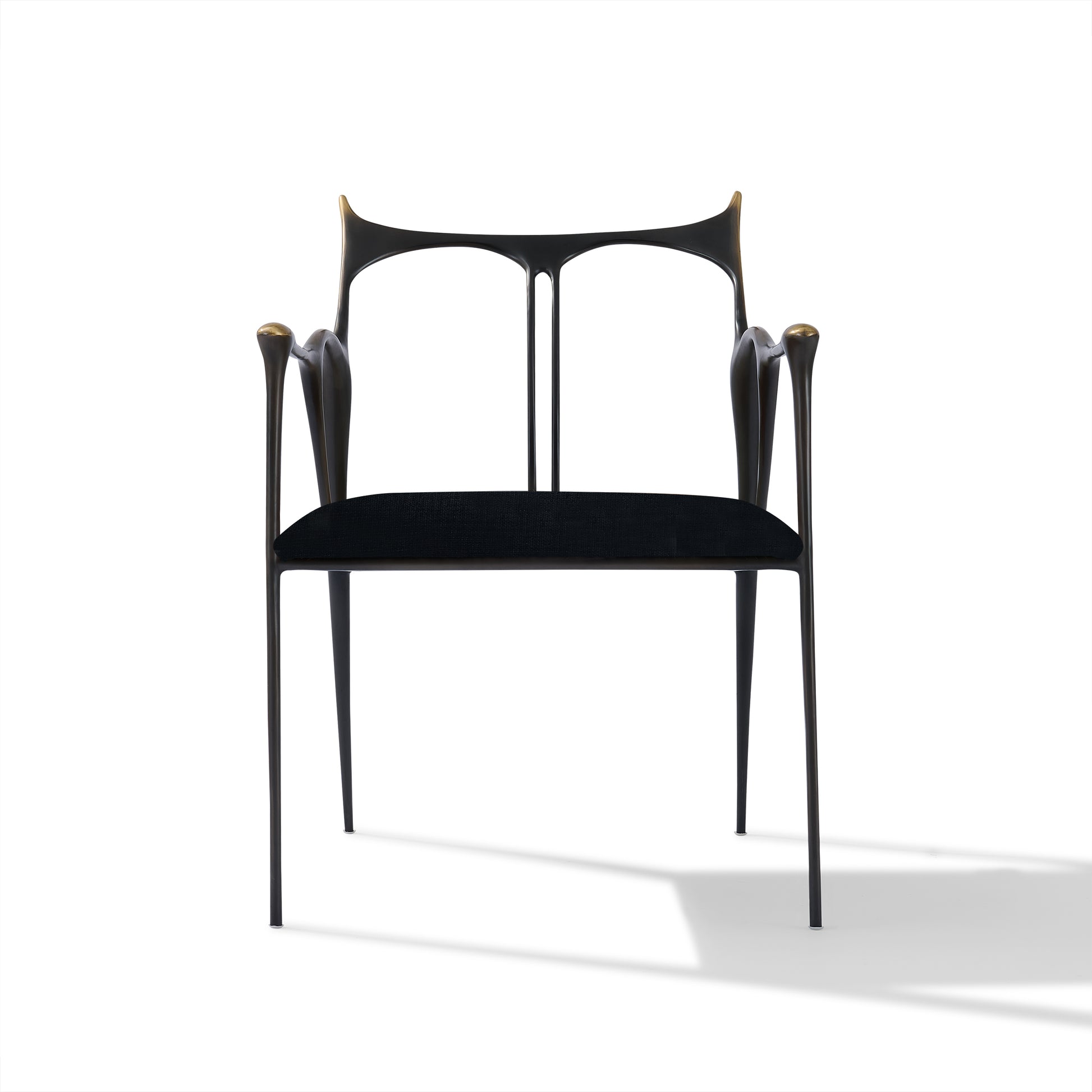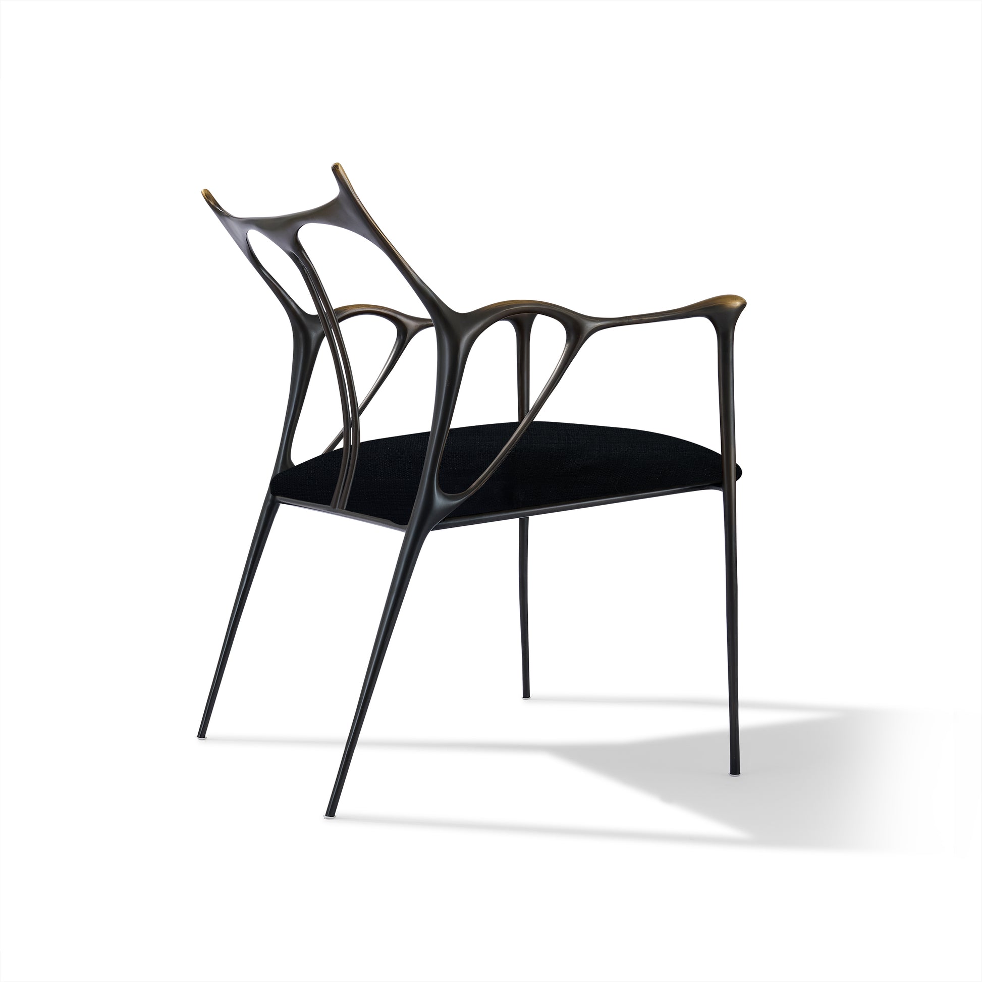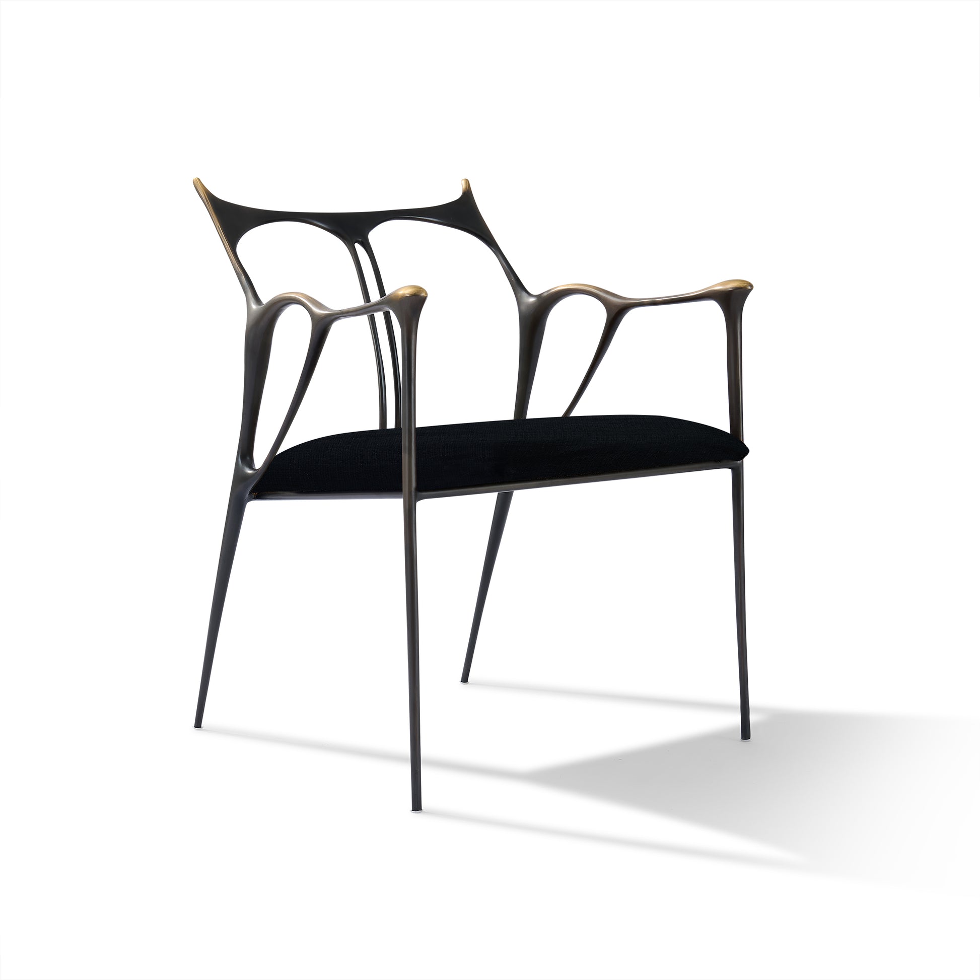 Shown in custom dark bronze metal with brushed gold accents and black fabric.